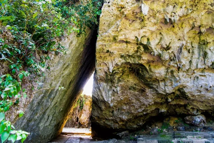 Sefa-Utaki, a UNESCO World Heritage Site and one of Okinawa's most important attractions, features a dramatic triangular rock formation called the Sangui — historically accessible only to Okinawa's highest priestesses, the Noro. Today it's open to visitors, but it remains an active altar. The paths are steep, made of wet limestone, and genuinely hazardous in anything other than proper walking shoes. Sandals and heels have caused real accidents here.